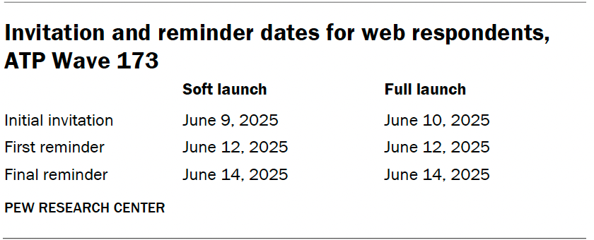 DownloadInvitation and reminder dates for web respondents, ATP Wave 173 ← Prev Page 1 … 4 5 6 7 8 … 10 Next Page →