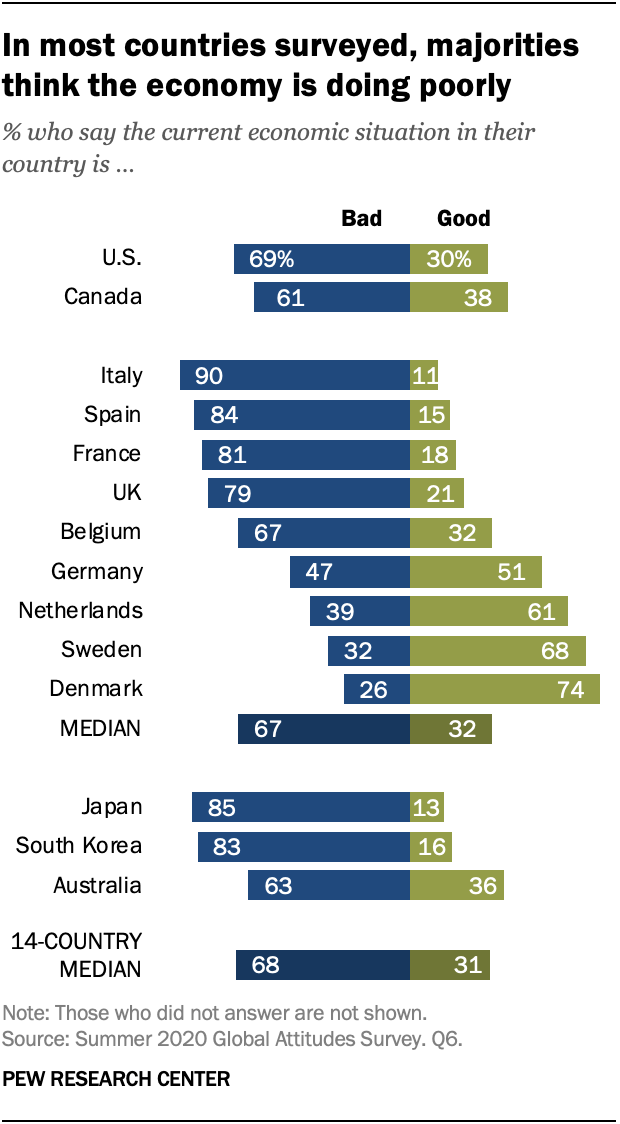 In most countries surveyed, majorities think the economy is doing poorly