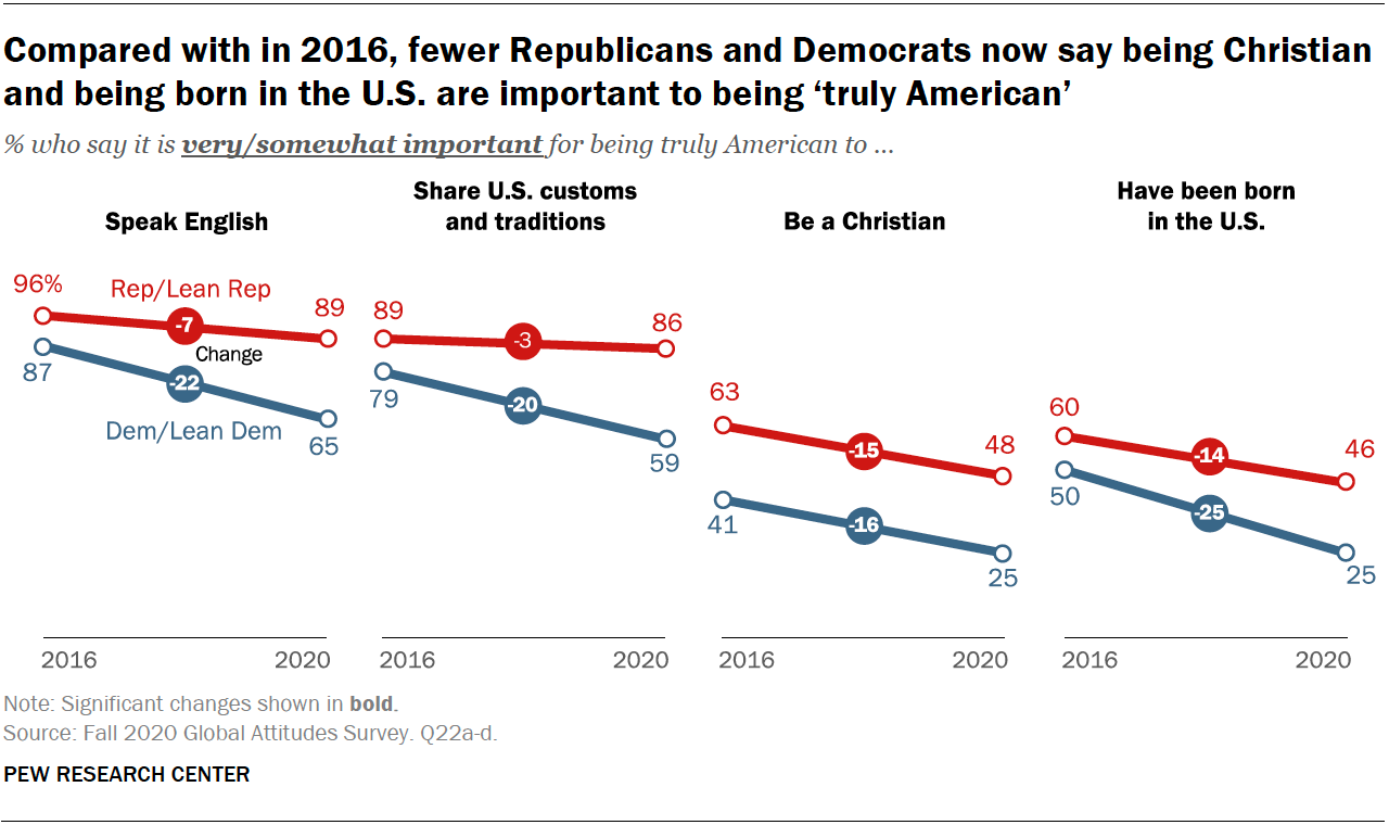 DownloadCompared with in 2016, fewer Republicans and Democrats now say being Christian and being born in the U.S. are important to being ‘truly American’