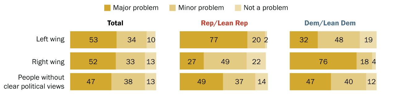 - Just over half of Americans see left-wing (53%) and right-wing (52%) extremism as major problems. Nearly as many (47%) say this about extremism from “people without clear political views.”