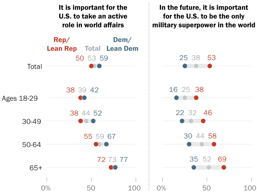 - 39% of adults ages 18 to 29 and 44% of those 30 to 49 say it is extremely or very important that the U.S. play an active role in world affairs.
