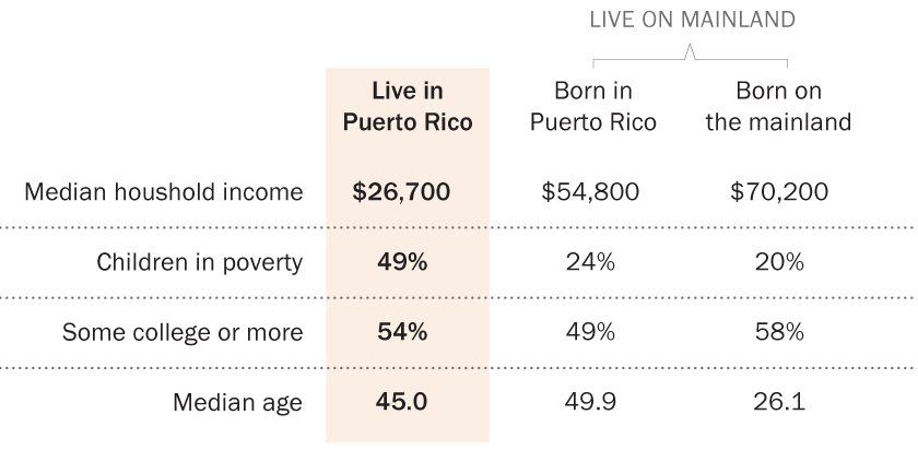 Puerto Ricans living on the island tend to have lower incomes and higher rates of child poverty than those living on the mainland. For example, those on the island had a median household income of $26,700 in 2024. That compared with $54,800 for Puerto Ricans who were born on the island but live on the mainland and $70,200 for those who were born and live on the mainland.
